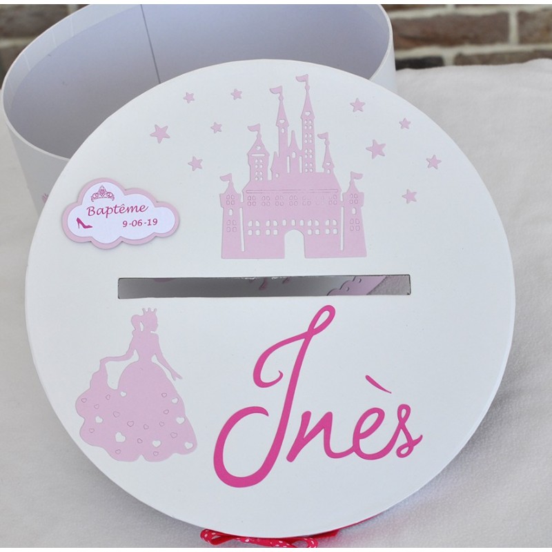 Sur le dessus, un château entouré d'étoiles. Le prénom de votre princesse est découpée et une étiquette en forme de nuage reprend la date du baptême.