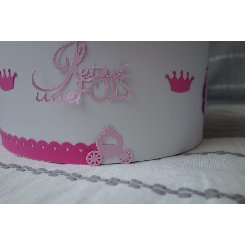 Sur le dessus, un château entouré d'étoiles. Le prénom de votre princesse est découpé. Il y a également une photo.